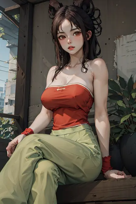 关键词 bare shoulders, bare arms, black hair, large breasts, red strapless bellyband,strapless ,red wristband,brown eyes, collarbone,