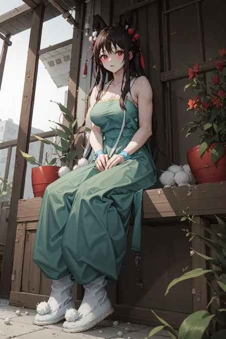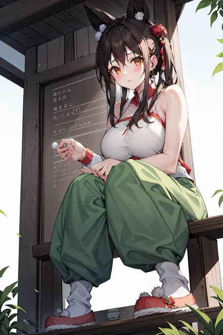 키워드: 벌거벗은 어깨, 벌거벗은 팔, 검은 머리, 큰 가슴, 빨간 스트랩 없이 착용하는 배bands, 스트랩 없는, 빨간 손목밴드, 갈색 눈, 아래턱,