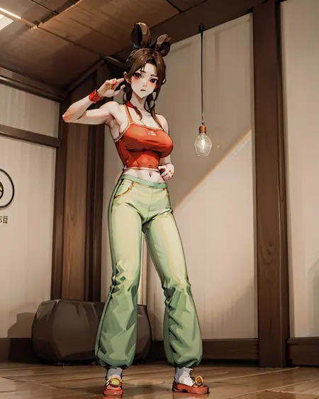 '빛나는 초록색 헐거운 팬츠, 초록색 바지, 빨간 신발, 신발, 라인이 잘 드러난, 흰색 양말, 발등 부분에 흰색 장식용 볼(1.3), 신발에 흰색 장식용 솜망치',