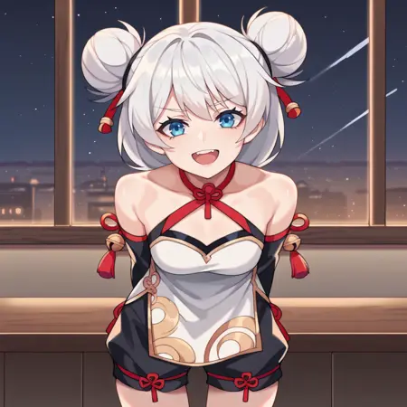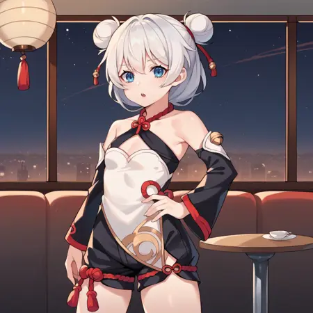 Teri, Fol001, Tr_Suh, theresa apocalypse, blue eyes, white hair, double hair bun, puffy shorts, black shorts, detached sleeves, bare shoulders, red ribbon, chinese clothes, wide sleeves, long sleeves, alt black sleeves, red tassel, red thigh strap, bell, tassel hair ornament, black hood, hood down, neck ribbon, halter top, strapless shirt, white shirt, print shirt,