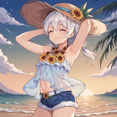 Teri,Fol001,Tr_Ssu,Theresa Apocalypse,蓝眼,白发,低双马尾,太阳裙,浅蓝色连衣裙,透明连衣裙,毛边短裤,蓝色短裤,白色腰带,肚脐,向日葵,草帽,花环项链,帽花,