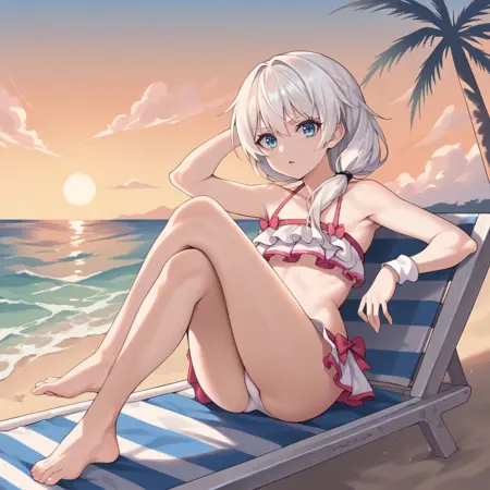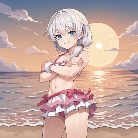 Teri, Fol001, Tr_Shi, theresa apocalypse, blue eyes, white hair, side ponytail, frilled bikini, two-tone bikini, white bikini, pink bikini, frilled wristband, bikini skirt, frills,