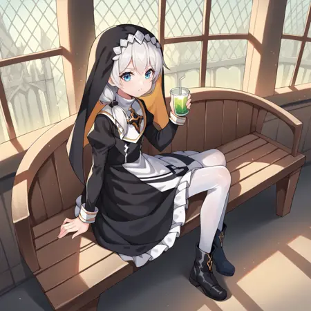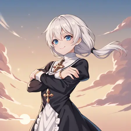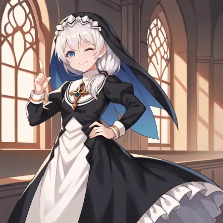 Optional: Add "nun veil" for her Veil version and "white pantyhose, black footwear, boots" if you are generating with legs in the image, otherwise the nun dress will cover her legs.