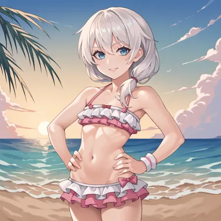 Teri,Fol001,Tr_Shi,Theresa Apocalypse,蓝眼,白发,侧马尾,荷叶边比基尼,双色比基尼,白色比基尼,粉色比基尼,荷叶边腕带,比基尼裙,荷叶边,