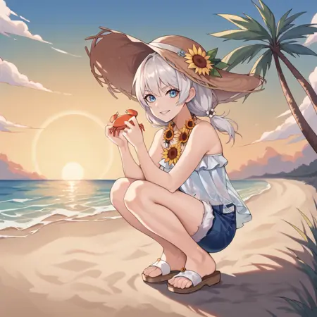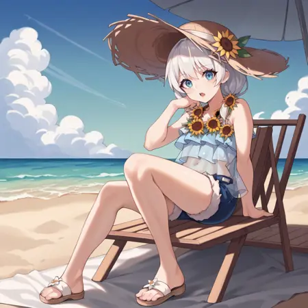 Teri, Fol001, Tr_Ssu, theresa apocalypse, blue eyes, white hair, low twintails, sundress, light blue dress, see-through dress, fur-trimmed shorts, blue shorts, white belt, navel, sunflower, straw hat, flower necklace, hat flower,