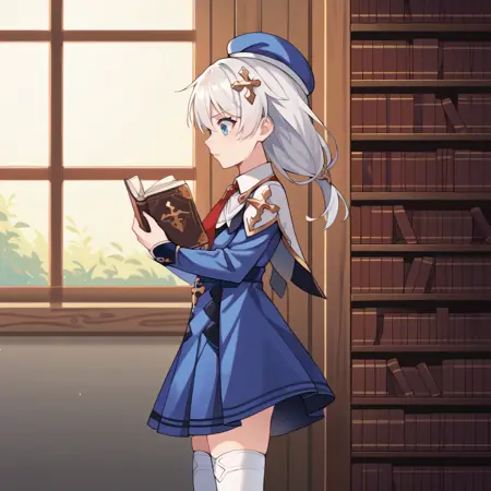 Teri, Fol002, Tr_Cdt, theresa apocalypse, blue eyes, white hair, side ponytail, red necktie, collared dress, blue dress, capelet, white capelet, alt long sleeves, blue sleeves, dark blue belt, cross necklace, beret, blue headwear, cross hairclip, white thighhighs, thighhighs, pleated skirt, blue skirt,