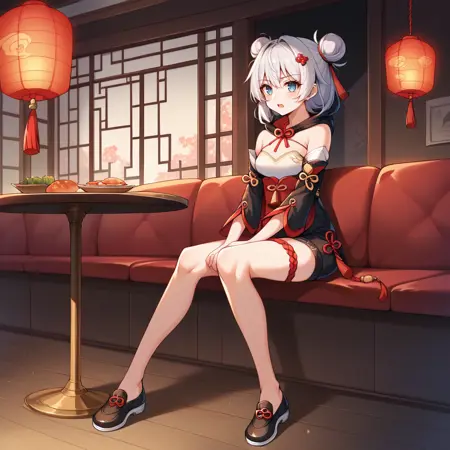 Teri, Fol001, Tr_Suh, theresa apocalypse, blue eyes, white hair, double hair bun, puffy shorts, black shorts, detached sleeves, bare shoulders, red ribbon, chinese clothes, wide sleeves, long sleeves, alt black sleeves, red tassel, red thigh strap, bell, tassel hair ornament, black hood, hood down, neck ribbon, halter top, strapless shirt, white shirt, print shirt,