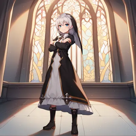 Optional: Add "nun veil" for her Veil version and "white pantyhose, black footwear, boots" if you are generating with legs in the image, otherwise the nun dress will cover her legs.