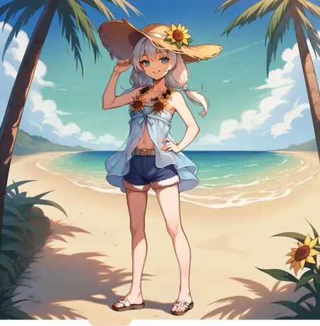 Teri, Fol001, Tr_Ssu, theresa apocalypse, blue eyes, white hair, low twintails, sundress, light blue dress, see-through dress, fur-trimmed shorts, blue shorts, white belt, navel, sunflower, straw hat, flower necklace, hat flower,