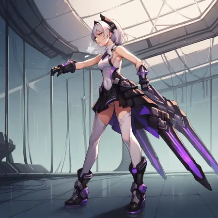 Teri, Fol002, Tr_Vil, theresa apocalypse, blue eyes, white hair, side ponytail, black headgear, white leotard, sleeveless turtleneck leotard, armored skirt, open skirt, black skirt, purple trim, spiked skirt, purple cross, black gauntlets, alt white thighhighs, alt thighhighs,