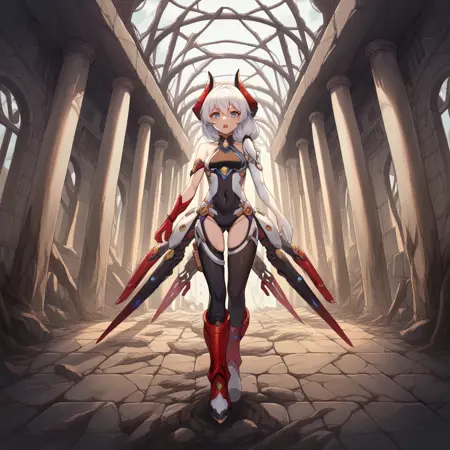 Teri, Fol002, Tr_Mit, theresa apocalypse, blue eyes, white hair, armored leotard, black leotard, halterneck, mechanical horns, covered navel, sideless outfit, white trim, miscolored gloves, single elbow glove, armored gloves, white glove, red glove, black thighhighs, black armored boots