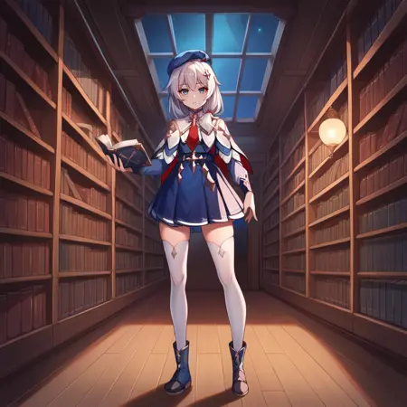 Teri, Fol002, Tr_Cdt, theresa apocalypse, blue eyes, white hair, side ponytail, red necktie, collared dress, blue dress, capelet, white capelet, alt long sleeves, blue sleeves, dark blue belt, cross necklace, beret, blue headwear, cross hairclip, white thighhighs, thighhighs, pleated skirt, blue skirt,
