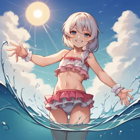 Teri, Fol001, Tr_Shi, theresa apocalypse, blue eyes, white hair, side ponytail, frilled bikini, two-tone bikini, white bikini, pink bikini, frilled wristband, bikini skirt, frills,