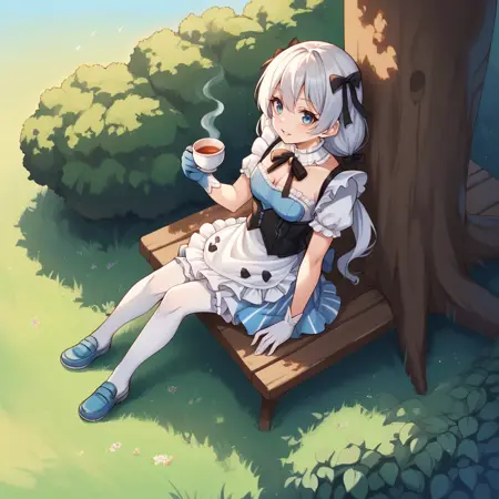 Teri, Fol003, Tr_Ali, theresa apocalypse, blue eyes, white hair, hair ribbon, black ribbon, black corset, corset, alt frilled skirt, alt frilled thighighs, alt white thighhighs, frilled apron, white apron, spade (shape), polka dot bow, light blue bow, light blue skirt, white underskirt, striped, cleavage, frilled blouse, light blue blouse, frills, alt neck ribbon, frilled collar, white collar, low twintails, alt miscolored gloves, alt white glove, light blue glove,