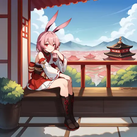 Teri, Fol003, Tr_Skr, theresa apocalypse, pink hair, red eyes, fox ears, japanese clothes, sleeveless kimono, red trim, white kimono, alt detached sleeves, alt sleeves, alternative long sleeves, alt bell, obi, big bow, striped bow, red bow, red obi, alt two-tone skirt, white skirt, red skirt, kimono skirt, skirt under skirt, black knee boots, cross-laced footwear