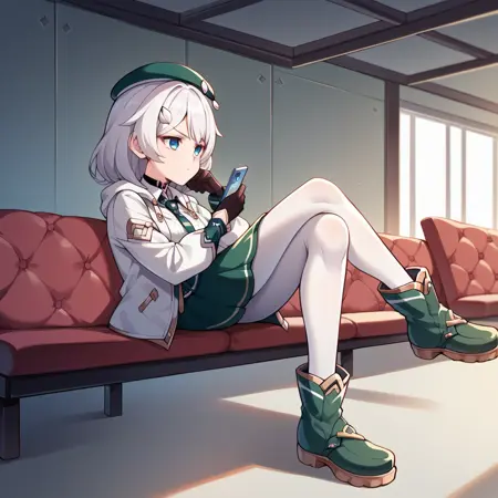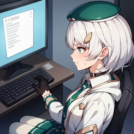 Teri,Fol003,Tr_Vrk,Theresa Apocalypse,蓝眼,白发,另类贝雷帽,深绿色贝雷帽,有领衬衫,另类白色衬衫,绿色领带,另类百褶裙,多层裙,深绿色裙子,带帽夹克,开襟夹克,耳环,黑色项圈,连裤袜,白色连裤袜,深绿色大腿绑带,发夹,另类颜色错乱手套,另类白色手套,黑色手套,另类长袖,深绿色袖口,白色夹克,