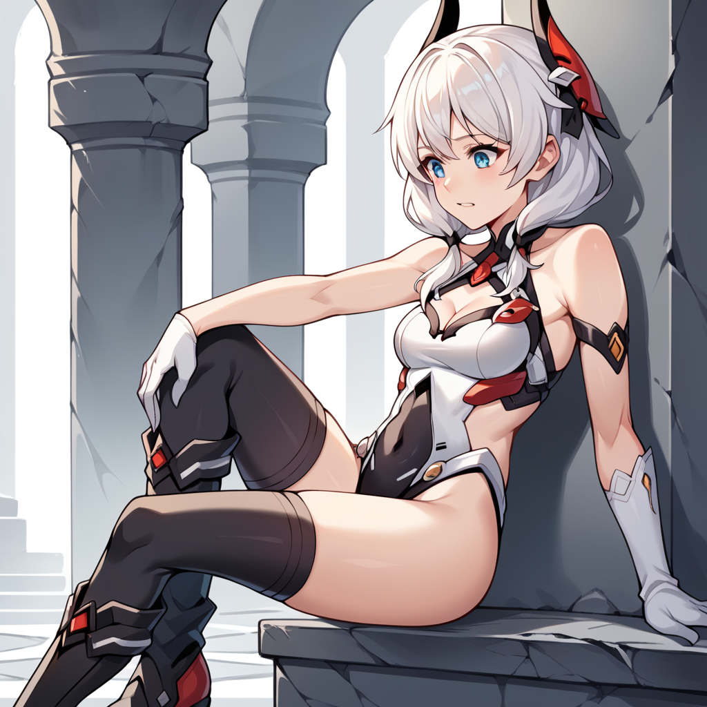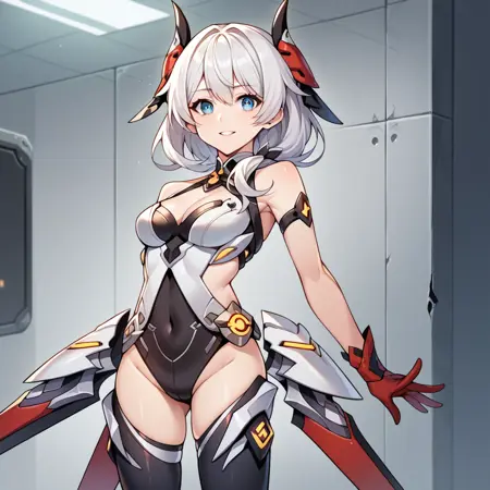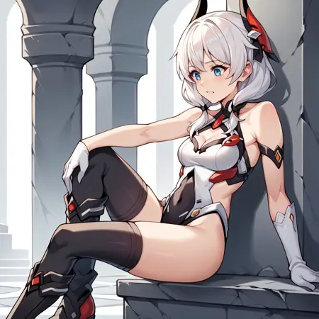 Teri,Fol002,Tr_Mit,Theresa Apocalypse,蓝眼,白发,护甲紧身衣,黑色紧身衣,吊颈,机械角,遮盖肚脐,无侧边服装,白色镶边,颜色错乱手套,单肘手套,护甲手套,白色手套,红色手套,黑色长筒袜,黑色护甲靴