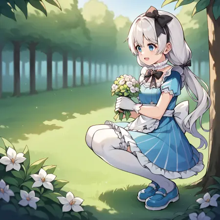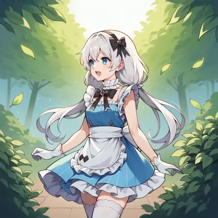 Teri_Alice, long hair, low twintails, frilled choker, choker, gloves, frilled dress, blue dress, apron, frilled white thighhighs, white gloves, polka dot, hair bow, short sleeves, bowtie,
