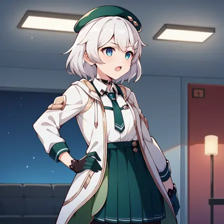 Teri_Idol, medium hair, beret, white jacket, green necktie, green skirt, black gloves, skirt, necktie, green headwear, collared shirt, pantyhose, white pantyhose, gloves, choker,