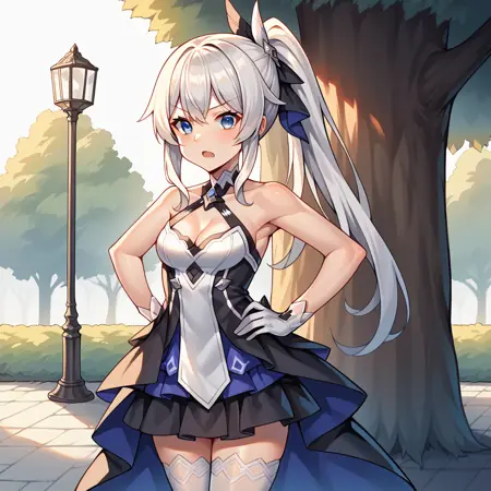 Teri,Fol002,Tr_Twp,Theresa Apocalypse,蓝眼,白发,马尾,高腰连衣裙,另类黑色连衣裙,荷叶边裙,不对称裙,蓝色裙,双色裙,蓝色镶边,中央镂空,蓝宝石,另类白色长筒袜,另类长筒袜,手套,白色手套,单角发饰,另类吊颈,露胸,白色胸甲,裸露肩膀,臂环,