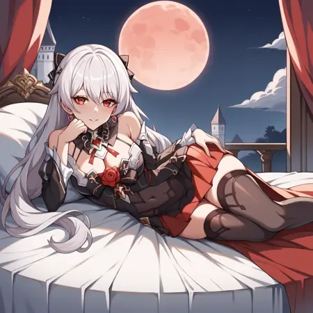 Teri, Fol006, Tr_Lnv, theresa apocalypse, long hair, mature body, red eyes, white hair, straped dress, red rose, other black dress, hair bow, black bow, alt covered navel, chest bow, different black sleeves, mature body, large breasts, alternative halterneck, alt puffy long sleeves, altternate wide sleeves, frilled gorget, cleavage, red earrings, black hairclip, alternate jewelry, heart necklace, alternate corset, zettai ryouiki, alt black corset, bodystocking, alternative open skirt, long skirt, alt red underskirt, different black skirt, alternative frilled skirt, short skirt, alt red skirt, asymmetrical legwear, torn legwear, single thighhigh, single leg pantyhose, pantyhose under thighhigh, miscolored thighighs, alt black thighighs, brown thighhighs,