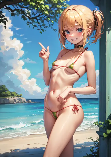 "string-only microbikini"는 실질적으로 없는 크기이거나 끈과 같은 크기로 유두나 질을 가립니다. 즉 컵 없는, 속옷 부분이 없는 브라지지가 아닙니다. 예상한대로 아주 생성하기 어려운 편이며, 특히 큰 가슴일 경우 더욱 그렇지만, 일부 애니메이션 모델에서는 가능합니다. 끈 전용에 더 잘 반응하는 초기 버전의 로라를 업로드했으나, otherwise는 훨씬 더 불안정합니다.