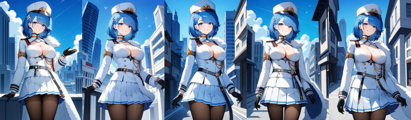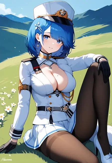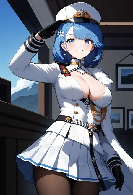 outfit1aachapa, short hair, blue hair, hair ornament, peaked cap, white headwear, blue eyes, mole on breast, breasts, military uniform, cleavage, white jacket, long sleeves, black gloves, pleated skirt, white skirt, black pantyhose