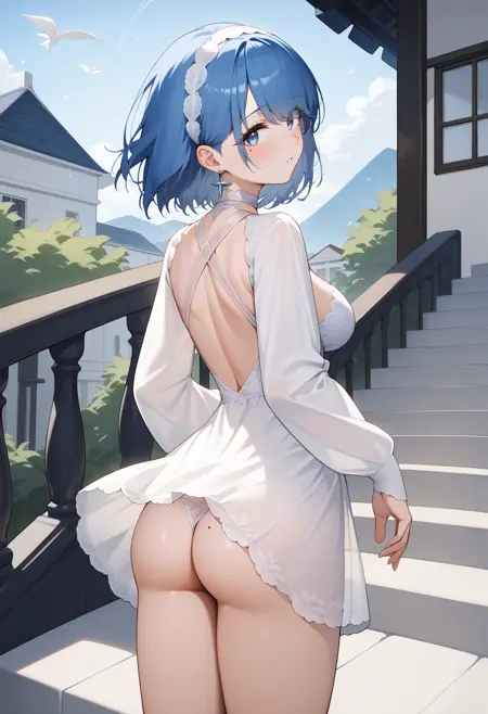 outfit3aachapa, short hair, blue hair, white hairband, earrings, blue eyes, mole on breast, white choker, nightgown, cleavage, lace-trimmed dress, see-through dress, white dress, long sleeves