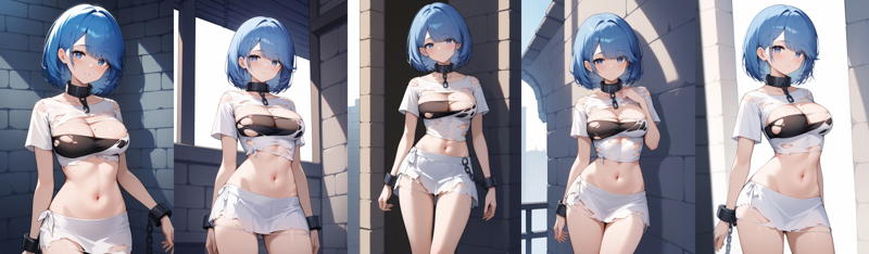 outfit2bbchapa, short hair, blue hair, blue eyes, mole on breast, breasts, collar, torn clothes, black tube top, torn shirt, white shirt, short sleeves, shackles, midrff, torn skirt, white skirt