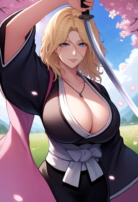 着物: ["rangiku_kimono, blue eyes, orange hair, long hair, mole under mouth, black kimono, pink shawl, wide sleeves, long sleeves, white sash"]