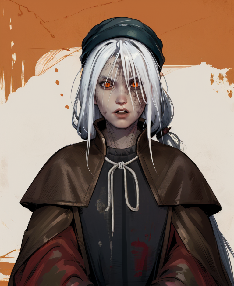 thepinter、オレンジ色の目、縦に細長い瞳孔、白い髪、長いポニーテール、髪が目を覆う