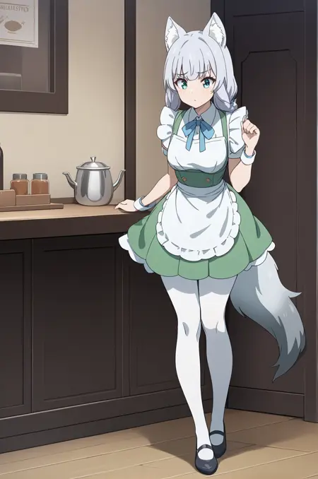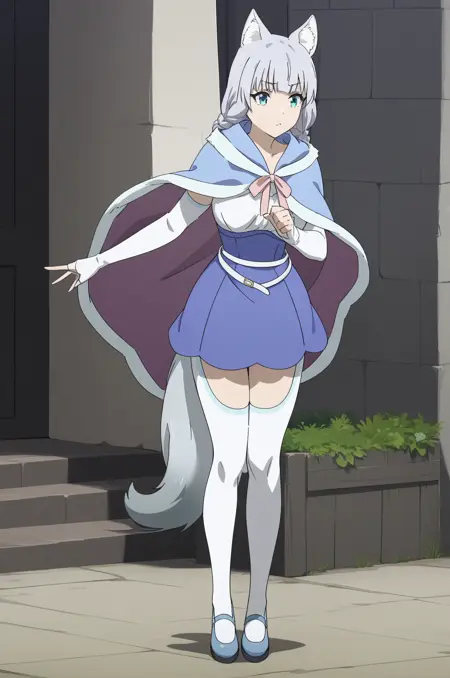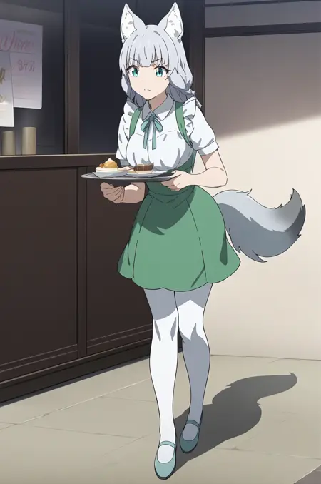 kemo-shigure,wolf til,蓝色连衣裙,斗篷,白色过膝袜,手套,绿色连衣裙,丝袜,女服务员