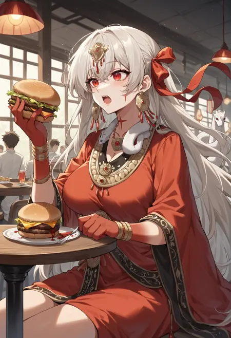 杜尔迦2: 长发,白发,红色丝带,红眼,额饰,珠宝,耳环,蛇,手上有血,红裙,印度服饰