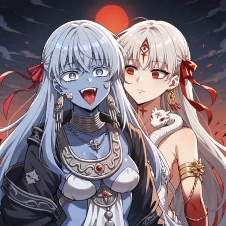 杜尔迦: 长发,白发,红色丝带,红眼,额饰,珠宝,耳环,蛇,手上有血,暴露的服装,骨盆帘