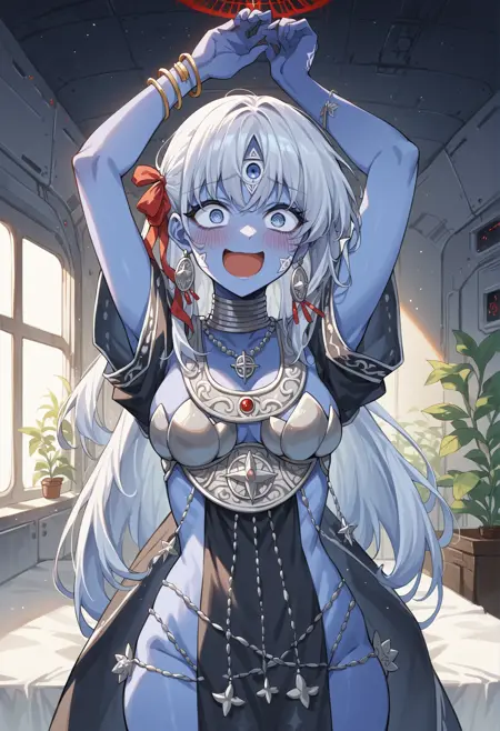 迦梨: 蓝色皮肤,彩色皮肤,长发,灰发,粉红色丝带,蓝眼,彩色睫毛,第三只眼,面部纹饰,耳环,珠宝,盔甲,手镯,脚镯,额外手臂,蛇