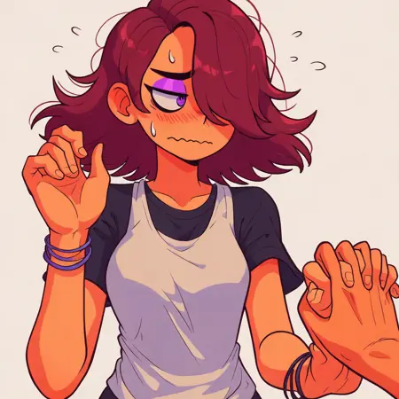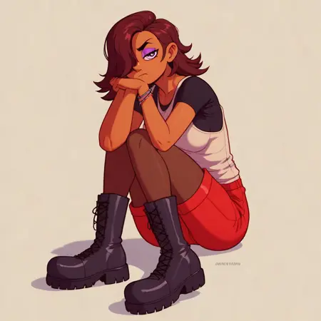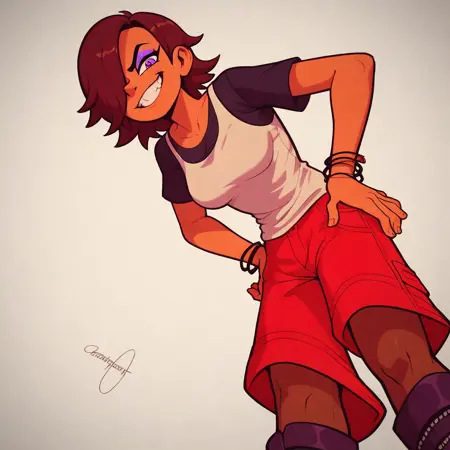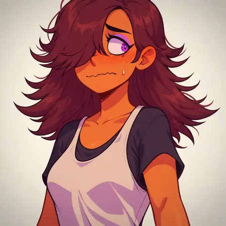 SD1.5 V1, PONY V1: dark skin, brown hair, hair over one eye, purple eyeshadow, purple eyes