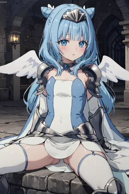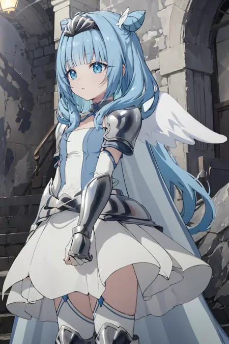 복장: 흰색 드레스, 갑옷 드레스, 어깨 보호대, 갑옷 장갑, 갑옷 부츠, 갑옷 티아라, 흰색 허벅지 스타킹, 흰색 망토
