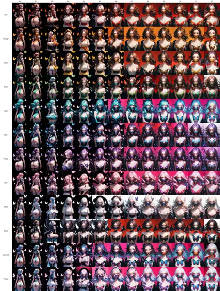 权重在 0.5 到 1.0(或略高)之间效果良好,0.5~0.7 可能不会出现蝴蝶。