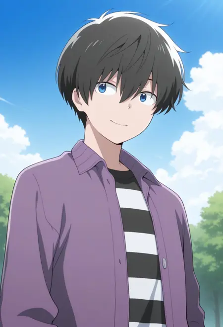 makikatsuragi, 1boy, male focus, solo, blue eyes, black hair, hair between eyes, school uniform, shirt, white shirt, collared shirt, necktie, black necktie, striped necktie, jacket, blazer, blue jacket, pants, black pants,
