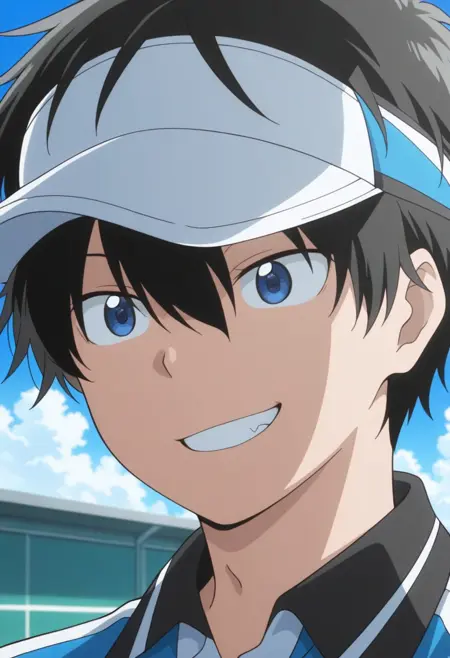 makikatsuragi, 1boy, solo, male focus, black hair, shorts, shoes, blue eyes, shirt, white shorts, socks, short sleeves, hair between eyes, sportswear, collared shirt, white shirt, blue shirt, sneakers, tennis uniform - 追加: ビーサン帽