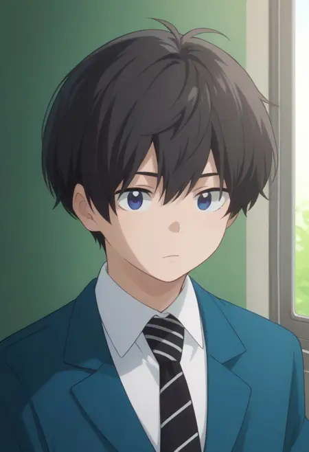 makikatsuragi, 1boy, male focus, solo, blue eyes, black hair, hair between eyes, school uniform, shirt, white shirt, collared shirt, necktie, black necktie, striped necktie, jacket, blazer, blue jacket, pants, black pants,