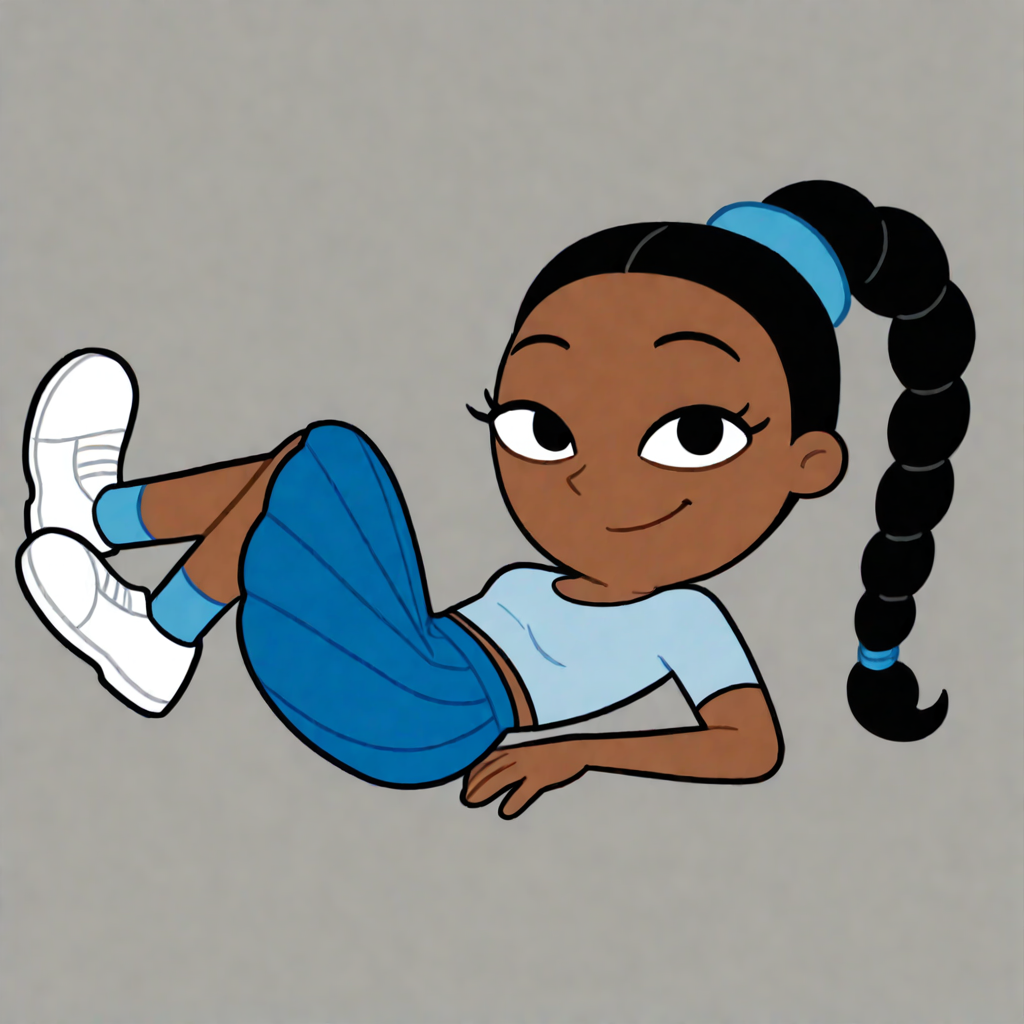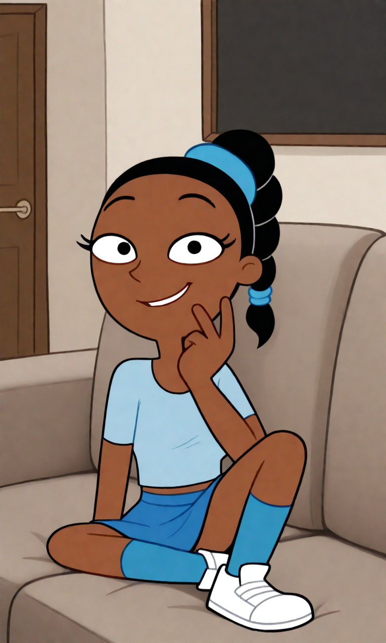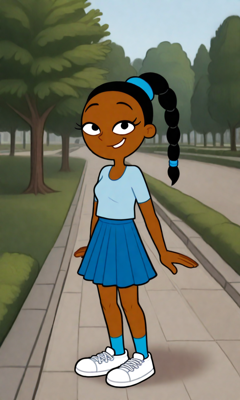 ChloeHA, 1girl, black hair, black eyes, brown skin, braided ponytail, blue scrunchies
