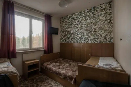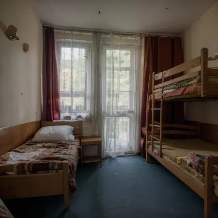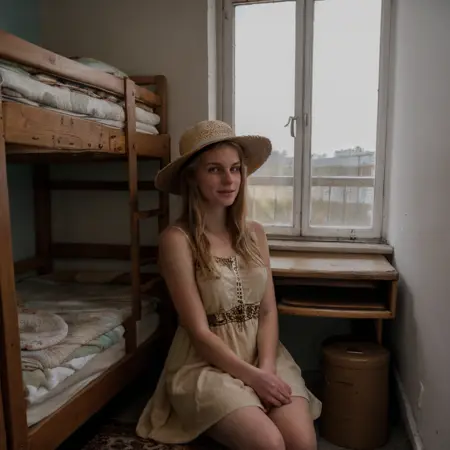 该Lora旨在重现20世纪60年代、70年代和90年代东欧建筑与风格,但经过岁月侵蚀,显得老旧而使用频繁。它能生成廉价休闲中心或夏令营建筑中典型的客房场景:大量旧家具杂乱地拼凑在一起,以最大限度利用每个房间狭小的空间。上下铺、木制书桌、布满灰尘的扶手椅、丑陋的地毯,还有带着怀旧感的窗户。