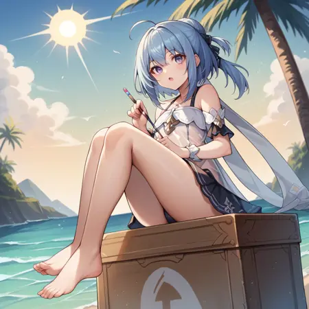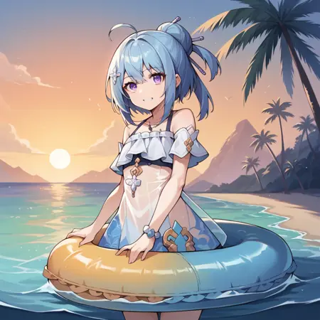 GrisHi3, Fol001, Grs_Snd, slender legs, thin legs, short hair, petite body, blue hair, purple eyes, ahoge, small chest, hair bun, shell necklace, sundress, see-through dress, see-through, strap dress, gradient dress, alt white dress, light blue dress, detached sleeves, white short sleeves, wrist ribbon, eyewear hang, sunglasses, denim shorts, shorts under dress, blue shorts, bead bracelet, white thighband, shell anklet, white thigh strap, shoulder straps, hair stick, paintbrush hair ornament, navel visible through clothing, cleavage, black hairclip,