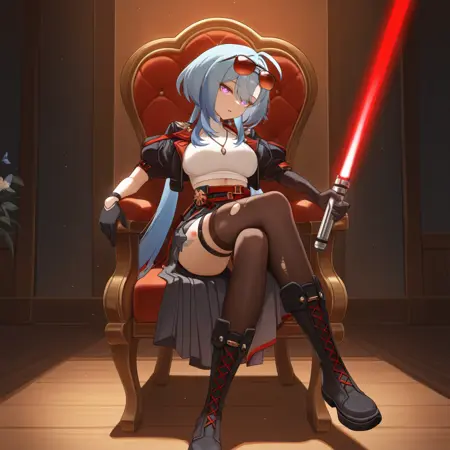GrisHi3, Fol003, Grs_Gok, 날씬한 다리, 가늘다리, 파란 머리, 보라색 눈, 아호게, 낮은 트윈테일, 목걸이, 흰 크롭탑, 리브된 셔츠, 대체 크롭 재킷, 검은 재킷, 빨간 테두리, 스러그(의류), 검은 스러그, 머리에 안경, 빨간 톤의 안경, 선글라스, 땋은 머리, 여러 벨트, 빨간 벨트, 검은 장갑, 터틀넥, 장갑, 한쪽 팔 보호대, 잠금뼈 컷아웃, 회색 문신, 꽃 문신, 엉덩이 문신, 허리, 긴 치마, 대체 주름진 치마, 대체 검은 치마, 반 치마, 흰 속옷, 찢어진 허벅지 양말, 갈색 허벅지 양말, 검은 허벅지 끈,
