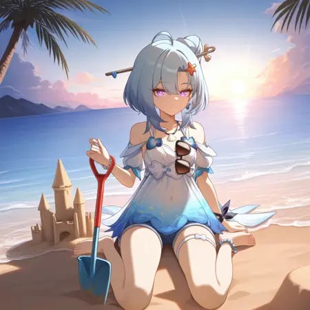 GrisHi3, Fol001, Grs_Snd, 날씬한 다리, 가늘다리, 짧은 머리, 작은 체형, 파란 머리, 보라색 눈, 아호게, 작은 가슴, 머리 땋기, 조개 목걸이, 선데이레스, 투명 드레스, 투명, 끈 드레스, 그라데이션 드레스, 대체 흰 드레스, 밝은 파란 드레스, 분리형 소매, 흰 짧은 소매, 손목 끈, 안경 매달기, 선글라스, 데님 반바지, 드레스 밑 반바지, 파란 반바지, 구슬 팔찌, 흰 허벅지 끈, 조개 발목줄, 흰 허벅지 끈, 어깨 끈, 머리 막대, 붓 모양 머리 장식, 옷을 통한 배꼽 노출, 가슴선, 검은 머리핀,