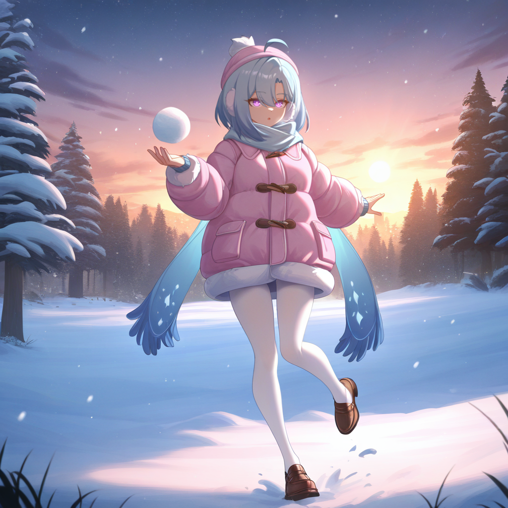 Gris_Anime, 겨울복, 분홍 겨울코트, 파란 스카프, 분홍 머리장식, 베레모, 빨간 장갑, 귀마개, 긴 소매,