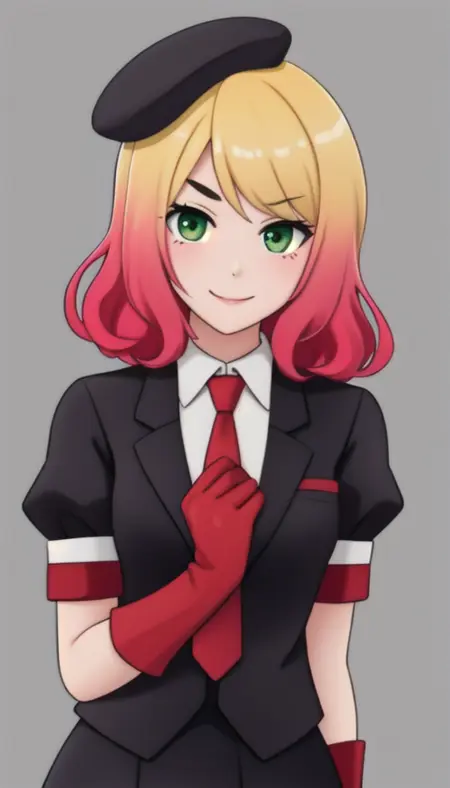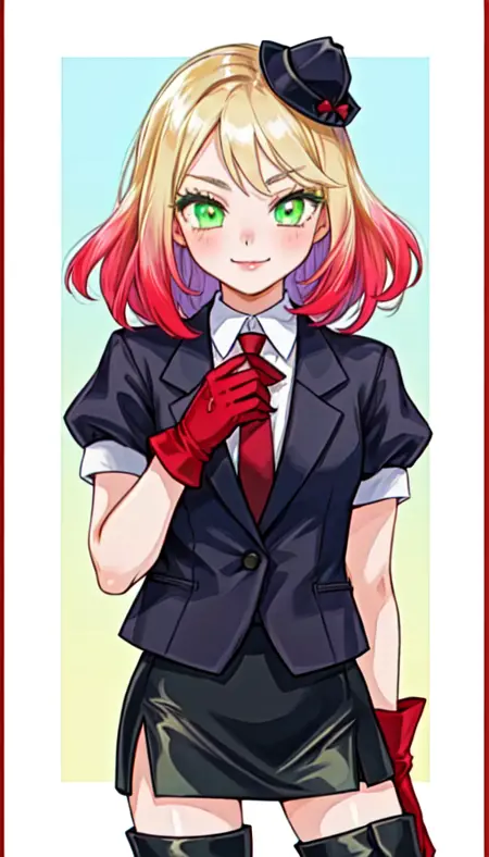 white shirt, necktie, black jacket, red gloves, black skirt, miniskirt, short puffy sleeves