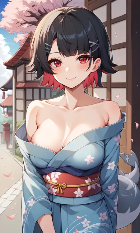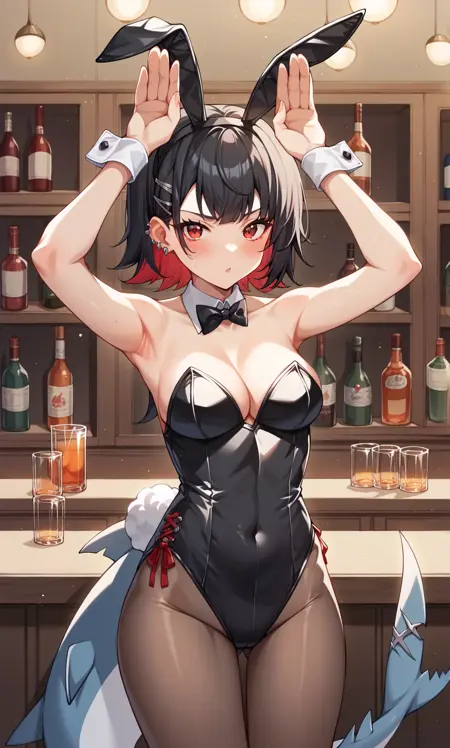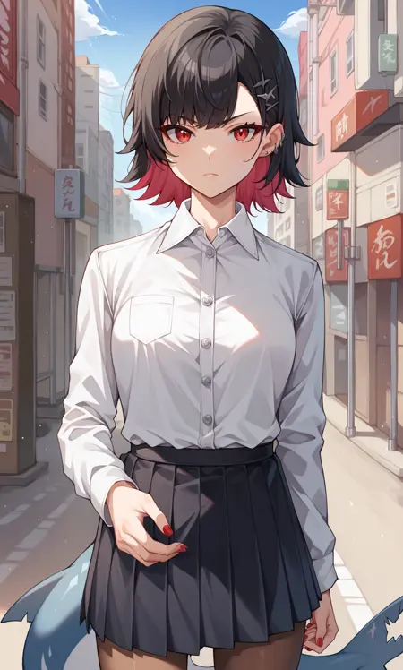 외모: 엘렌, 빨간 눈, 검은 머리, 단발, 색상 내부 머리카락, 헤어클립, 귀 piercing, 지느러미, 상어 꼬리