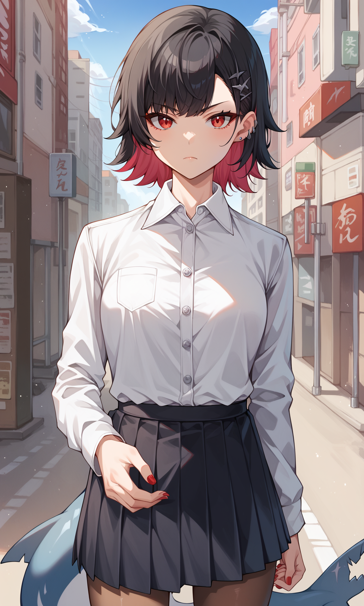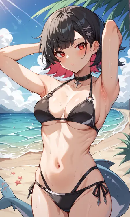 外貌:艾伦,红眼睛,黑发,短发,内层发色,发夹,耳洞,鳍,鲨鱼尾